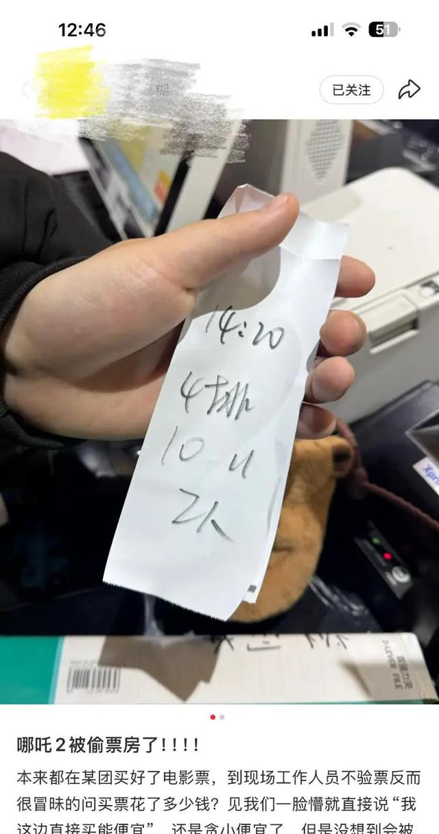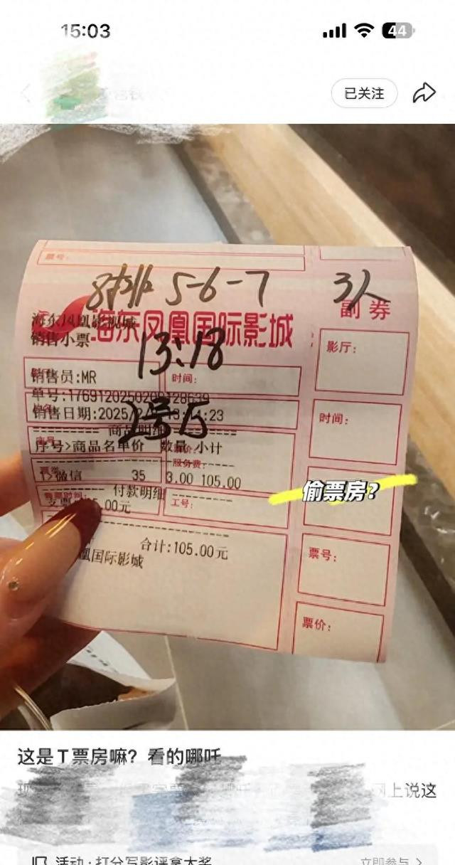 2月9日,一位来自青海的博主在酬酢平台上发帖称,他与一又友不雅看《哪吒2》时,收到了一张莫得打印机打票信息的手写票。