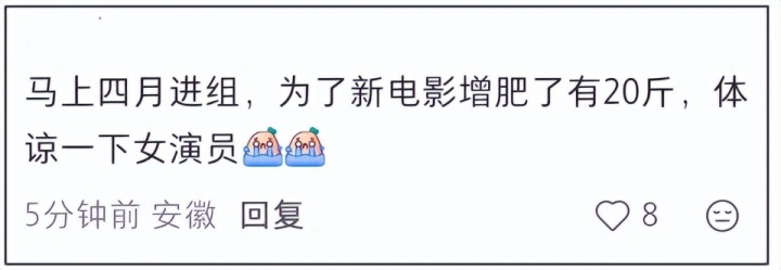 但最要道的据说,是粉丝那句讲明:“要进组了,为新电影增肥20斤。”