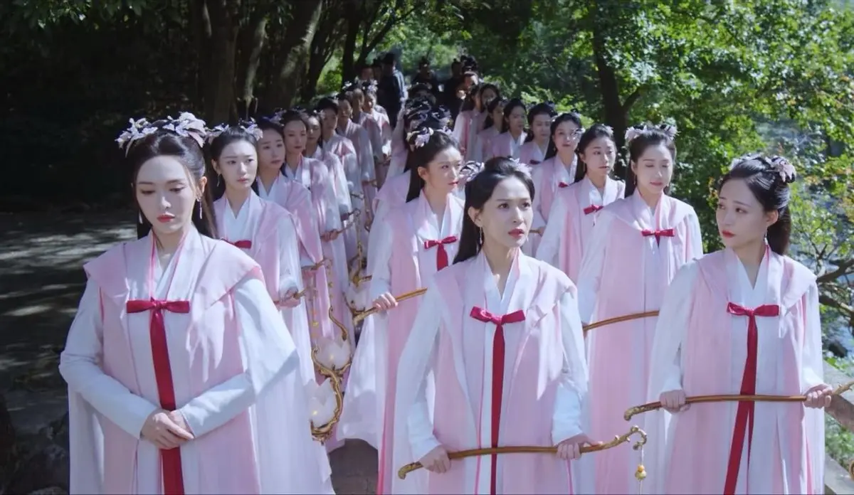 姬谭音出场时混入婢女的行列中,穿着孤单粉嫩的穿戴,在一众婢女中属她个头高肩膀宽,一下子就把傍边的女演员烘托的既青娥又亭亭玉立。