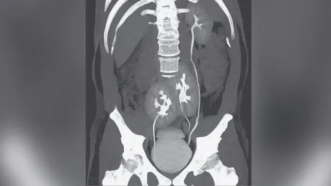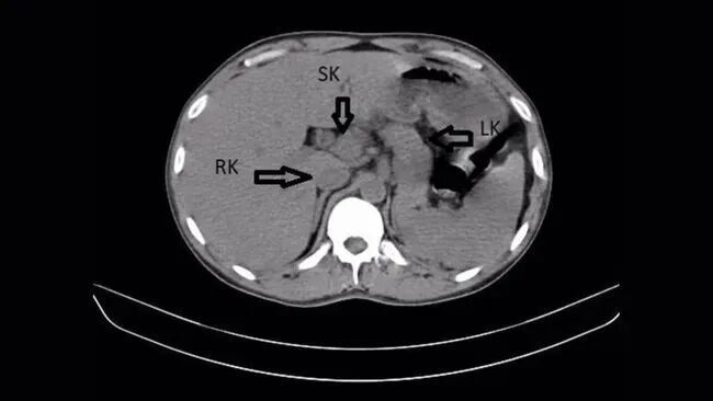 在腹部超声和 CT 扫描下,大夫发现患者体内竟存在第三个肾脏,即所谓“突出肾”(supernumerary kidney)。该突出肾位于右侧,并与原有右肾承接,举座呈现出类似马蹄形的结构。